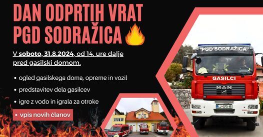 Z veseljem vas vabimo na DAN ODPRTIH VRAT PGD Sodražica, ki bo potekal v soboto, 31. avgusta 2024, od 14. ure dalje.