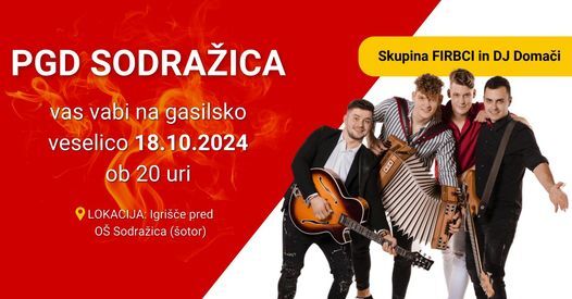 PGD Sodražica vas vabi na gasilsko veselico v petek, 18.10.2024 z skupino Firbci in DJ Domači s pričetkom ob 20. uri. Prireditev bo na igrišču pred osnovno šolo Ivana Prijatelja. Poskrbljeno je za šotor tako, da bo prireditev v vsakem vremenu.