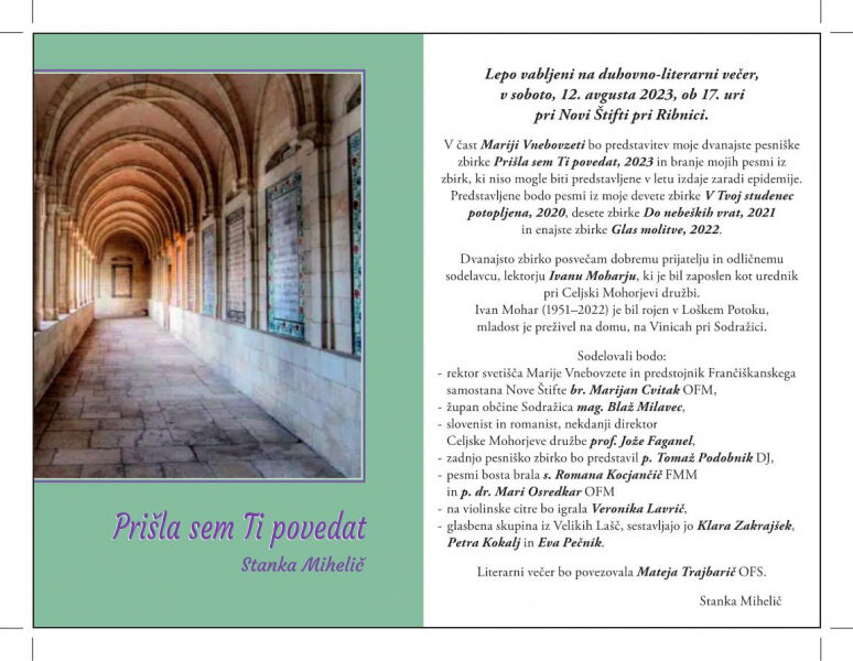 V čast Mariji Vnebovzeti bo predstavitev dvanajste pesniške zbirke Stanke Mihelič Prišla sem Ti povedat, 2023 in branje pesmi iz zbirk, ki niso mogle biti predstavljene v letu izdaje zaradi epidemije. Predstavljene bodo pesmi iz devete zbirke V Tvoj studenec potopljena, 2020, desete zbirke Do nebeških vrat, 2021 in enajste zbirke Glas molitve, 2022.