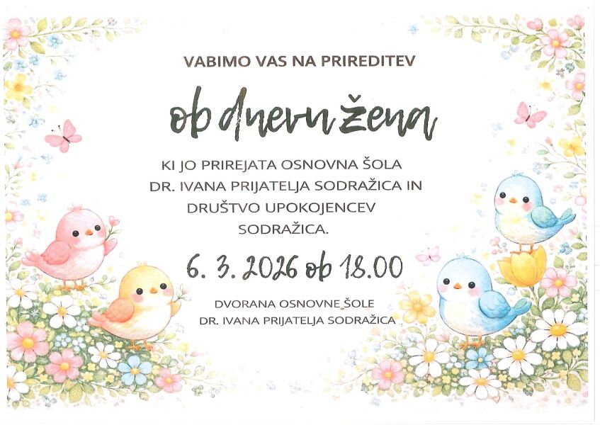 Vabimo vas na prireditev ob dnevu žena, ki jo prirejata Osnovna šola dr. Ivana Prijatelja Sodražica in Društvo upokojencev Sodražica. Prireditev bo v petek, 6. 3. 2025, ob 18. uri, v dvorani šole.