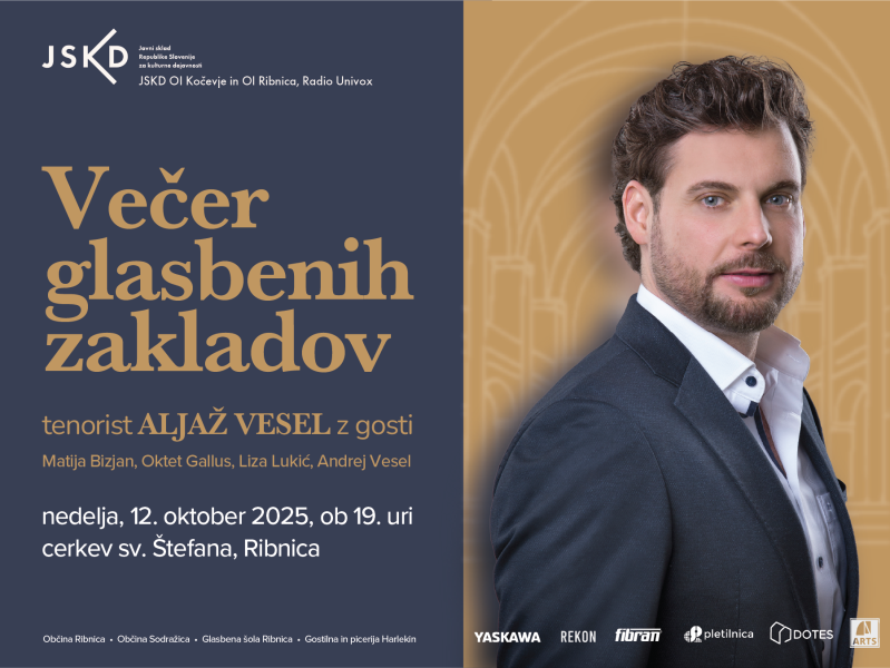 Tradicionalni koncert tenorista Aljaža Vesela z gosti bo v nedeljo, 12. oktobra, ob 20. uri, v cerkvi sv. Štefana v Ribnici. Nastopili bodo: Aljaž Vesel (tenor), Matija Bizjan (bas), Oktet Gallus Ribnica, Liza Lukić (klavir) in Andrej Vesel (klavir, umetniški vodja).