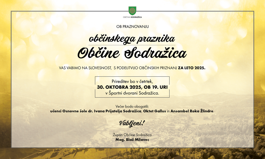 Ob praznovanju občinskega praznika Občine Sodražica vas vabimo na slovesnost s podelitvijo občinskih priznanj za leto 2025. Prireditev bo v četrtek, 30. oktobra 2025, ob 19. uri v Športni dvorani Sodražica.