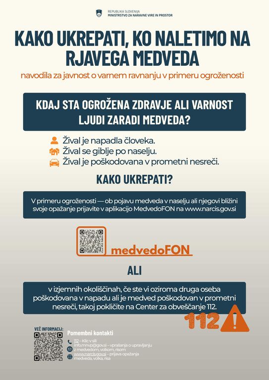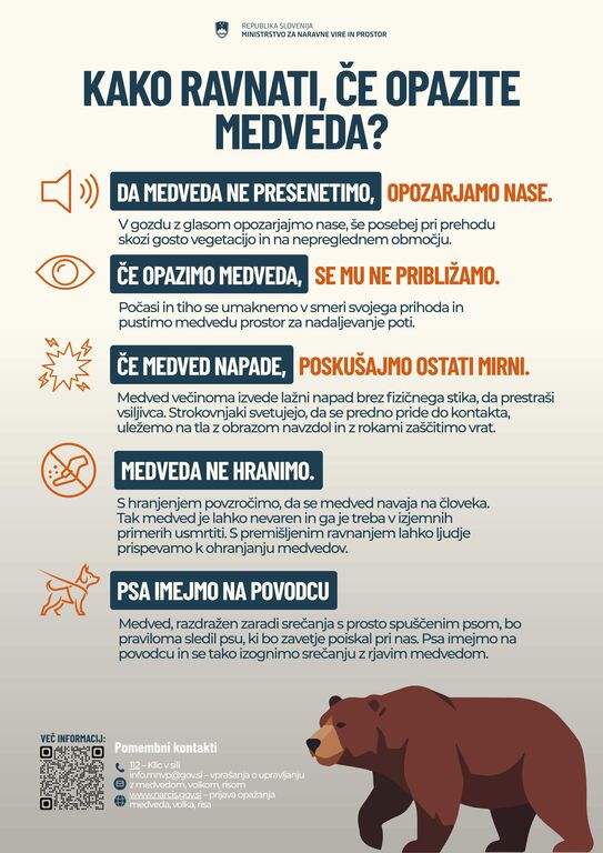 Ministrstvo za naravne vire in prostor obvešča javnost o ravnanju ob prisotnosti velikih zveri. V plakatu so navedena navodila za ravnanje ob srečanju z rjavim medvedom: