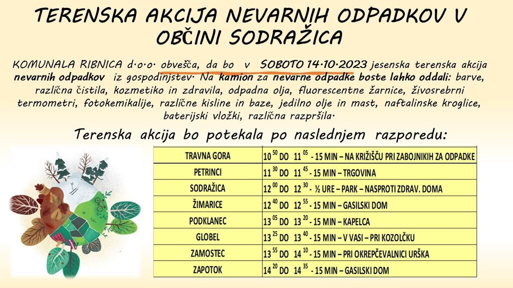 KOMUNALA RIBNICA d.o.o. obvešča, da bo v soboto,14. 10. 2023, jesenska terenska akcija zbiranja nevarnih odpadkov iz gospodinjstev. Na kamion za nevarne odpadke boste lahko oddali: barve, različna čistila, kozmetiko in zdravila, odpadna olja, fluorescentne žarnice, živosrebrni termometri, fotokemikalije, različne kisline in baze, jedilno olje in mast, naftalinske kroglice, baterijski vložki, različna razpršila.