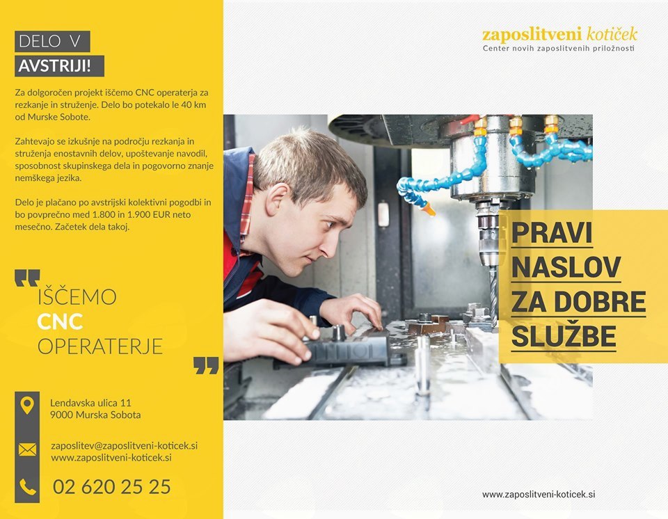 Zaposlitvena priložnost le skok čez mejo, le 40 km od Murske Sobote, se za delo v Avstriji iščejo CNC operaterji z izkušnjami pri rezkanju in struženju na CNC obdelovalnih strojih