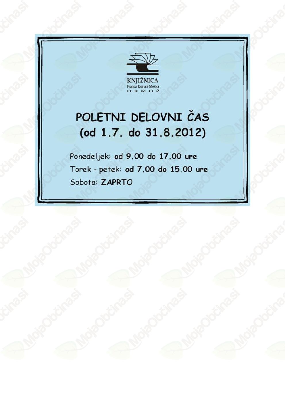 Vse občane in oblanke obveščamo, da je s prvim julijem začel veljati poletni delovni čas ormoške knjižnjice, ki bo trajal do 31. avgusta 2012.