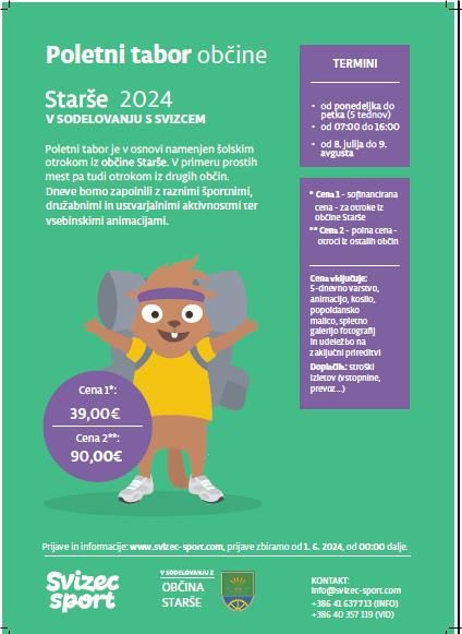 Tudi v letošnjem letu bomo v času poletnih počitnic organizirali poletni tabor za naše najmlajše. Prijave bodo odprte od 1.6.2024 dalje, vse podrobnosti glede prijav pa si lahko pogledate na naslednji povezavi: http://www.svizec-sport.com/poletni-tabor/, ker so tudi navedeni vsi termini.