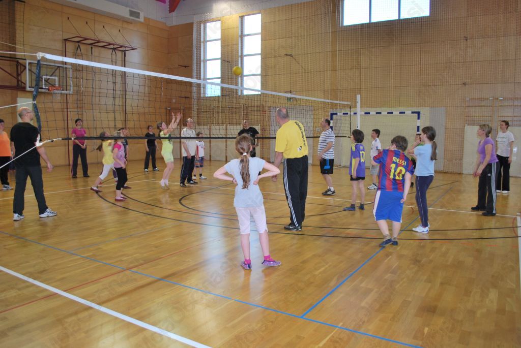 V prvi uri so se starši in učenci segreli v dvojicah - vsak otrok je bil v paru s svojim staršem, ko so se lovili in si med tekom na različne načine podajali žogo. Poskrbeli so tudi za segrevanje posameznih skupin mišic - vaje so izmenično pokazali mlajši in starejši udeleženci. Sledilo je delo po postajah, ki je precej dvignilo krvni tlak, nato pa so odigrali tekmovalno igro: zadevanje v kotalečo se žogo. Ekipi sta bili ob koncu tekme precej izenačeni.