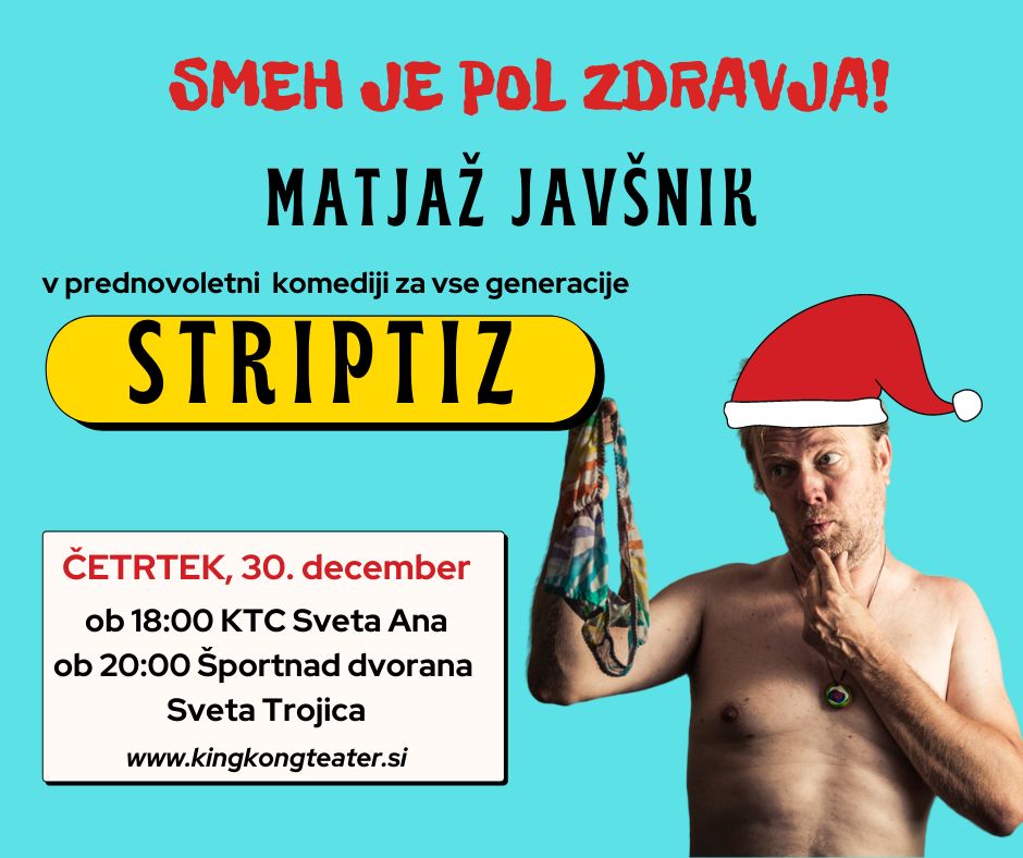 Matjaž s komedijo Striptiz na odru ne bo razgalil le sebe, temveč tudi vas – pravzaprav kar celotno Slovenijo. V Striptizu se sprehodi čez slovenske posebnosti in zanimivosti, pa tudi čez naše prednosti in slabosti. Skozi smeh se bomo spoprijeli z dvojino, ljubeznijo do pločevine, ki se blešči iz garaž in nadstreškov, družinskih vezi, športnih uspehov, slovenske šole, graditve kariere, interesnih skupin, javne uprave, pa vse do rak rane naše družbe – politike.