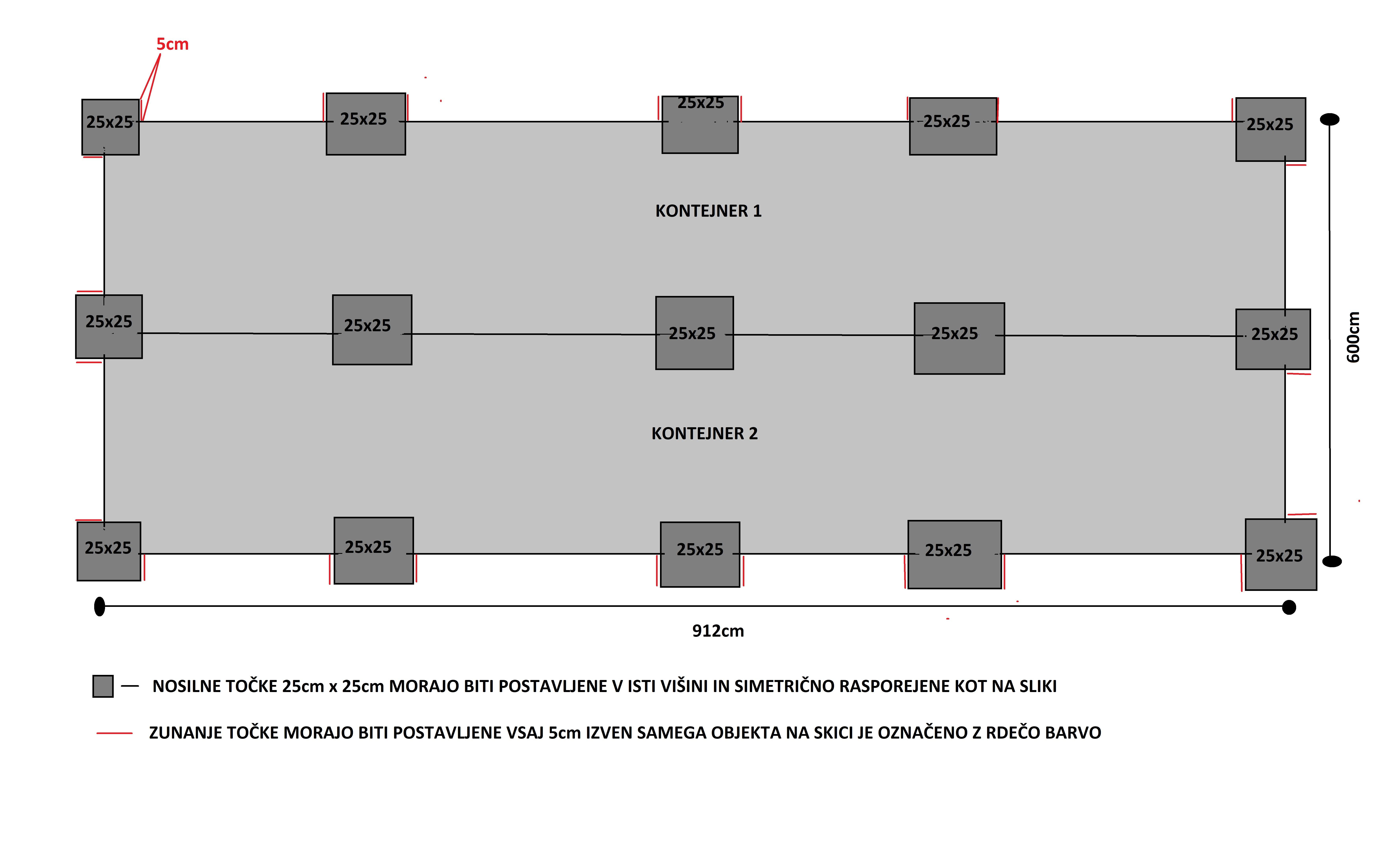 Za postavitev bivalnega zabojnika v dimenzijah 9m x 6m x 2,7m bo zravnana površina parcele in postavljenih 15 nosilcev velikosti 25cm x 25cm. V objektu bo poleg dnevnega prostora in spalnice tudi kuhinja in kopalnica z WC. (skica in načrt nosilcev)