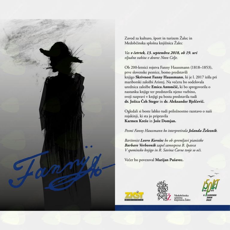 Ob 200-letnici rojstva Fanny Haussmann (1818–1853), prve slovenske pesnice, bomo predstavili knjigo Skrivnost Fanny Haussmann, ki je l. 2017 izšla pri mariborski založbi Aristej. Na večeru bo sodelovala urednica založbe Emica Antončič, ki bo spregovorila o nastanku knjige ter predstavila njeno vsebino, svoji razpravi v knjigi pa bosta predstavila tudi dr. Jožica Čeh Steger in dr. Aleksander Bjelčevič.