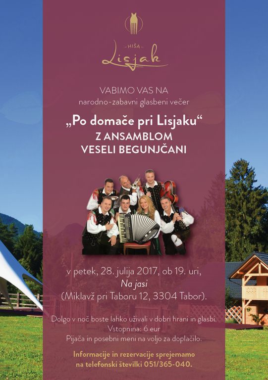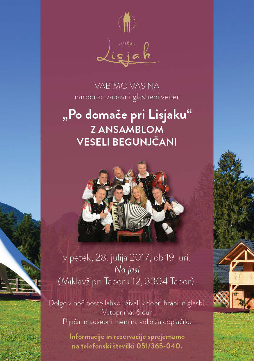 Vabljeni na narodno-zabavni glasbeni večer »Po domače pri Lisjaku« z ansamblom Veseli Begunjčani, ki bo v petek, 28. 7. 2017, na čudovito prenovljeni lokaciji v Miklavžu pri Taboru - Na jasi.