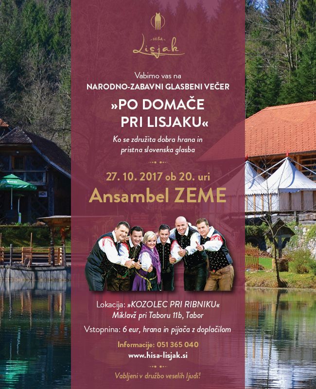 Vabljeni na narodno-zabavni glasbeni večer "Po domače pri Lisjaku" z ansamblom Zeme, ki bo v petek, 27. 10. 2017, na čudoviti lokaciji v Miklavžu pri Taboru - Kozolec pri ribniku.