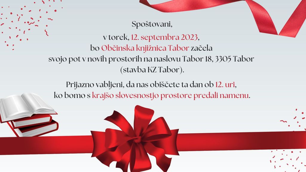 v torek, 12. septembra 2023, bo Občinska knjižnica Tabor začela svojo pot v novih prostorih na naslovu Tabor 18, 3305 Tabor (stavba KZ Tabor).