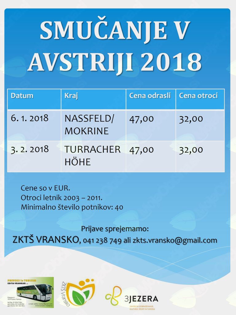 PRIJAVE IN INFORMACIJE: 041 238 749, ZKTŠ VRANSKO