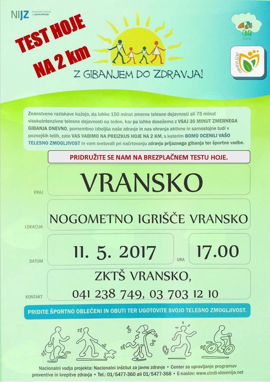 Znanstvene raziskave kažejo, da lahko 150 minut zmerne telesne dejavnosti ali 75 minut visokointenzivne telesne dejavnosti na teden, kar pa lahko dosežemo z VSAJ 30 MINUT ZMERNEGA GIBANJA DNEVNO, pomembno izboljša naše zdravje in nas ohranja aktivne in samostojne tudi v poznejših letih, zato VAS VABIMO NA PREIZKUS HOJE NA 2 KM, a katerim BOMO OCENILI VAŠO TELESNO ZMOGLJIVOST in vam svetovali pri načrtovanju zdravju prijaznega gibanja ter športne vadbe.