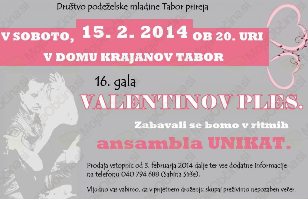 Valentinov ples je tradicionalni dogodek, ki na taborsko plesišče vsak februar privabi množico zaljubljencev - iz domače občine in okoliških krajev. Mladi člani DPMT Tabor smo veseli odličnega odziva med obiskovalci, ki se redno vračajo v Tabor - upamo, da bo tako tudi letos.