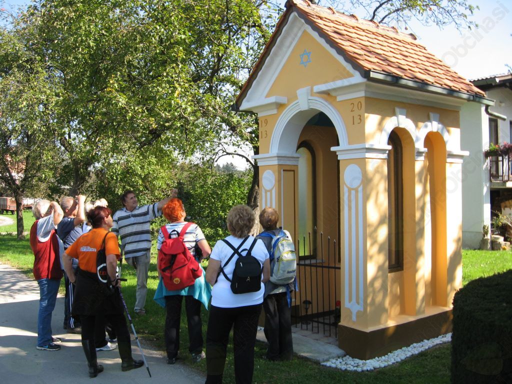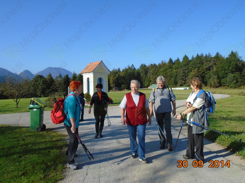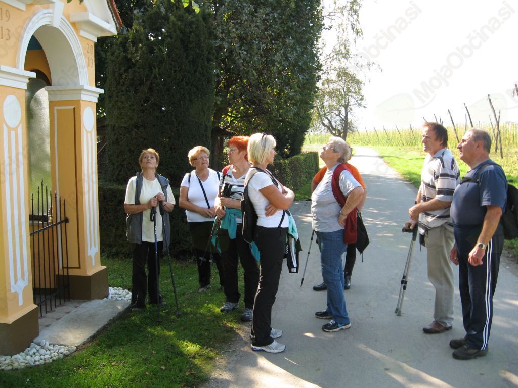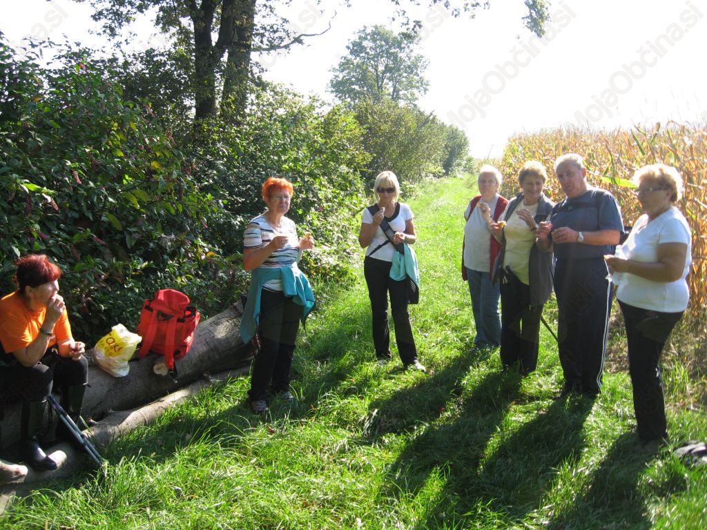 Zadnji torek v septembru, na lep, sončen dan, smo zvesti pohodniki upokojenskega društva zopet krenili na naš pohod. Tokrat nas je pot vodila iz Tabora po stari gozdni stezi do Grabnarjevih, potem mimo Urhovih, Žnidarjevih, čez polja "Devc" in preko glavne ceste do Gomilskega. Pri kmetiji Rančigaj smo krenili ob hmeljski žičnici do malega gozdiča v Borštih, pot nadaljevali ob njivah in travnikih do Gorjakovega, kjer smo si ob kratkem počitku pri Mihu in Jančki Kokole ogledali lani obnovljeno kapelo in prisluhnili "zgodovini " tega konca Kaple.