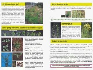 Ker se bliža čas cvetenja pelinolistne ambrozije, Uprava RS za varno hrano, veterinarstvo in varstvo rastlin opozarja imetnike kmetijskih in nekmetijskih zemljišč na obvezno zatiranje ambrozije, zlasti preprečevanje njenega cvetenja in nastanka semen. Kljub izvedenim številnim aktivnostim za ozaveščanje ljudi o tej problematiki se vsi imetniki zemljišč še vedno ne zavedajo, da so dolžni sami poskrbeti za pravočasno odstranjevanje ambrozije na svojem zemljišču. Na Upravi RS za varno hrano, veterinarstvo in varstvo rastlin (UVHVVR) smo se zato v letu 2018 na podlagi različnih pobud odločili za izvedbo širše akcije obveščanja o obveznem zatiranju pelinolistne ambrozije. Pripravili smozloženko in plakat, ki vsebujeta osnovne informacije in opozorila o pelinolistni ambroziji, in jih posredovali določenim ciljnim skupinam po Sloveniji.