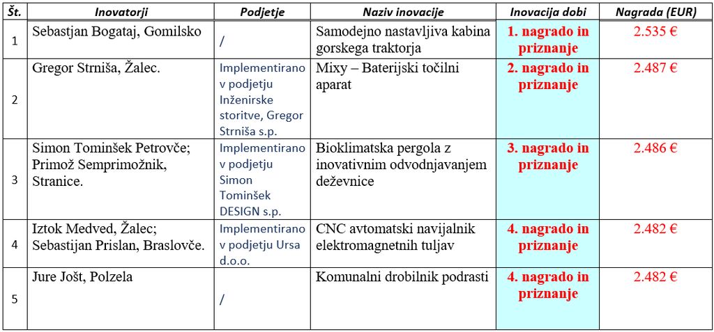Na aktualnem razpisu za leto 2024 je sodelovalo 14 inovacij, razvoj katerih je kreiralo 32 inovatorjev/inovatoric. Razlika ocene med najbolje in najslabše ocenjeno inovacijo pa je znašala le 1,05 od možnih 10 točk, kar je zgovoren podatek o kvaliteti prijavljenih inovacij. Tokrat je bilo nagrajenih 5 inovacij, od katerih si zadnji dve po seštevku točk delita 4 mesto.
