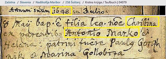 V krstni knjigi iz obdobja 1648-1667 (župnišče Šoštanj) sem našel podatek, da sta bila Antonio Marko in žena Helena roj. Gorizhnik starša Christine, rojene leta 1648 v Sv. Florjanu.