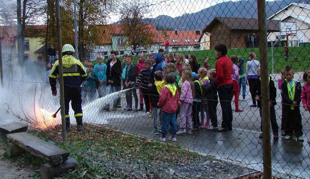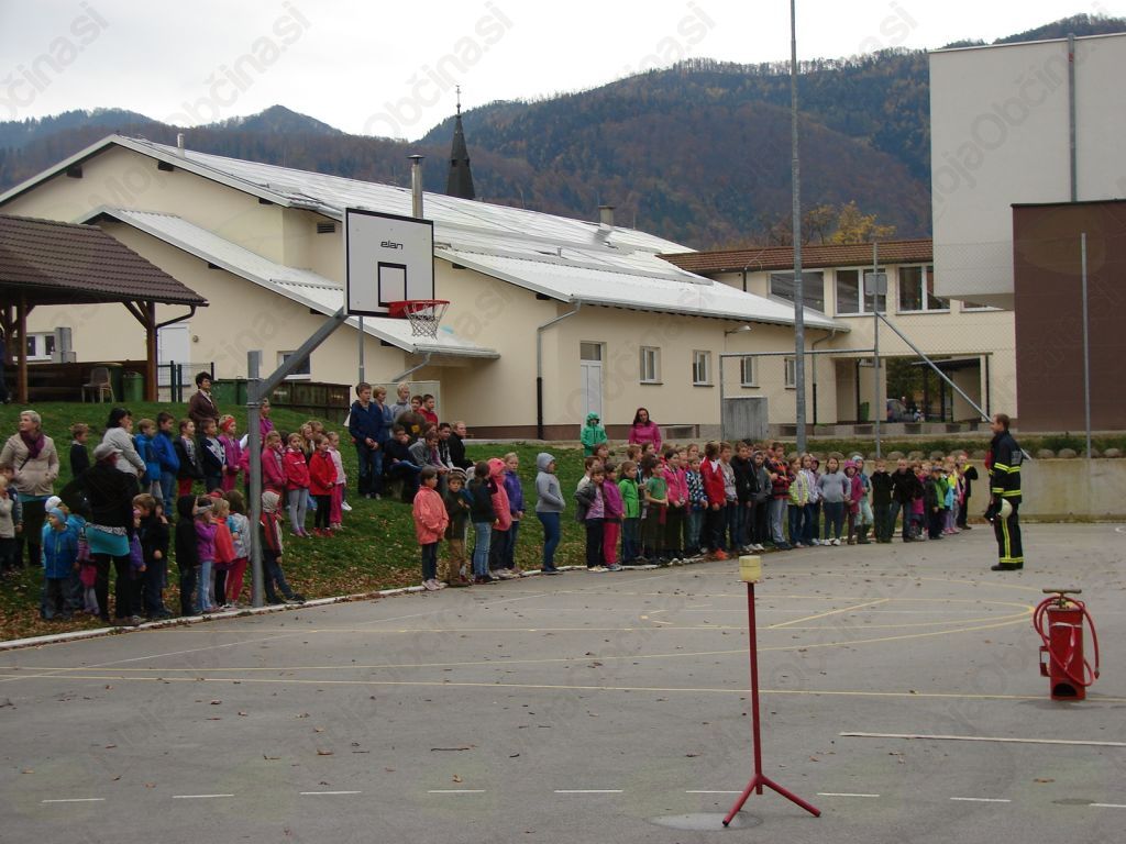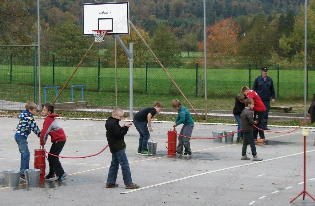 Poklicali so učence – mlade gasilce, ki hodijo na gasilske vaje. Postavili so se v kolono in predstavili disciplino, s katero tekmujejo: odšli so k vedrom. Tekli so do brentača ter vanj vlili vodo in to so ponovili. Naslednji je začel ciljati v palico. Na palici pa je bila steklenica. Bili so zelo uspešni. Po končani vaji smo se vrnili v učilnice k pouku.