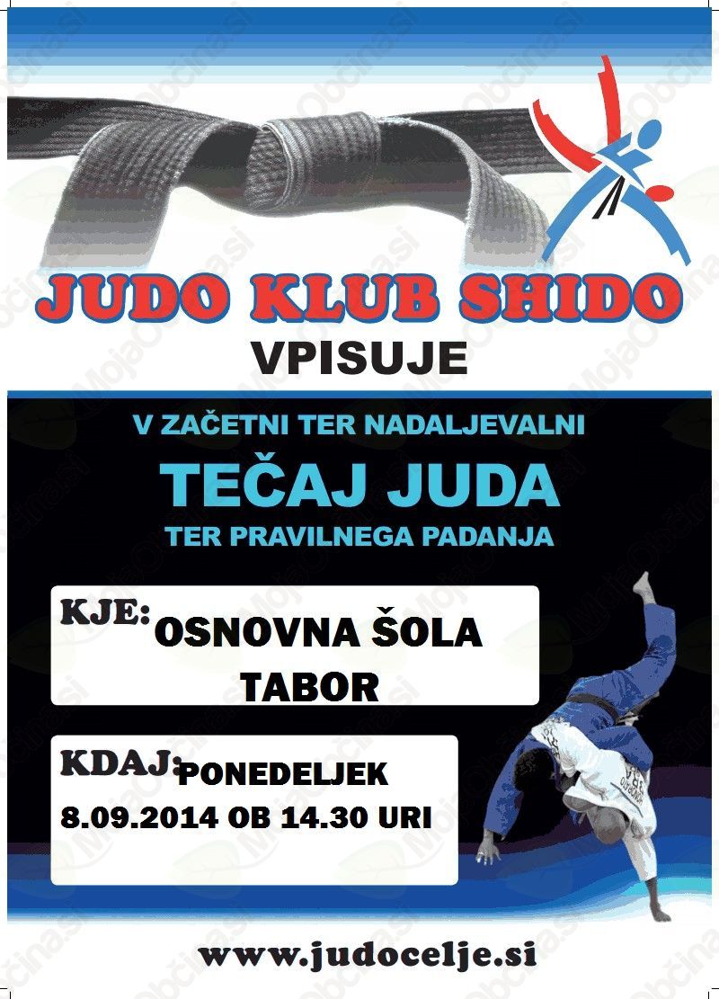 Judo klub Shido vpisuje v začetni ter nadaljevalni tečaj JUDA vsak ponedeljek v mesecu septembru od 8. 9. 2014 ob 14.30 v telovadnici POŠ TABOR ali po elektronski pošti judoklubshido@gmail.com. Prav tako pričenjamo tudi z judom v vrtcu, in sicer v starosti od 4 do 6 leta.