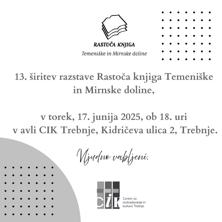 Center za izobraževanje in kulturo Trebnje, varuh prve stalne razstave RASTOČA KNJIGA TEMENIŠKE IN MIRNSKE DOLINE, prisrčno vabi na njeno trinajsto širitev,