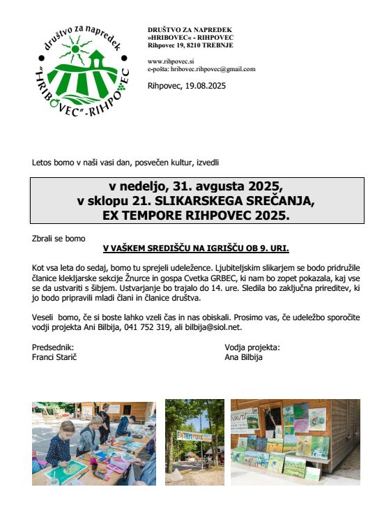 Kot vsa leta do sedaj, je organizator za nedeljo, 31. avgusta 2025, povabil likovne ustvarjalce in tudi goste, ki bodo ustvarjali ali demonstrirali izdelke svoje dejavnosti. Tako se bodo ljubiteljskim slikarjem pridružile članice klekljarske sekcije Žnurce (Društvo Praetorium Latobicorum) in gospa Cvetka Grbec, ki bo pokazala, kaj vse se da ustvariti s šibjem. Ustvarjanje bo trajalo do 14. ure. Sledila bo zaključna prireditev, ki jo bodo pripravili mladi člani in članice društva.