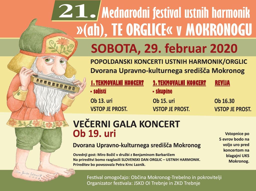 Na večernem koncertu bodo nastopili najboljši s tekmovalnega koncerta in revije. Kot gost večera bo nastopil vrhunski orgličar/ustni harmonikar MIRO BOŽIČ v družbi z BENJAMINOM BARBARIČEM (12- strunska klasična kitara). Festival bomo okronali z razglasitvijo zadnje soboto v februarju za SLOVENSKI DAN ORGLIC – USTNIH HARMONIK.