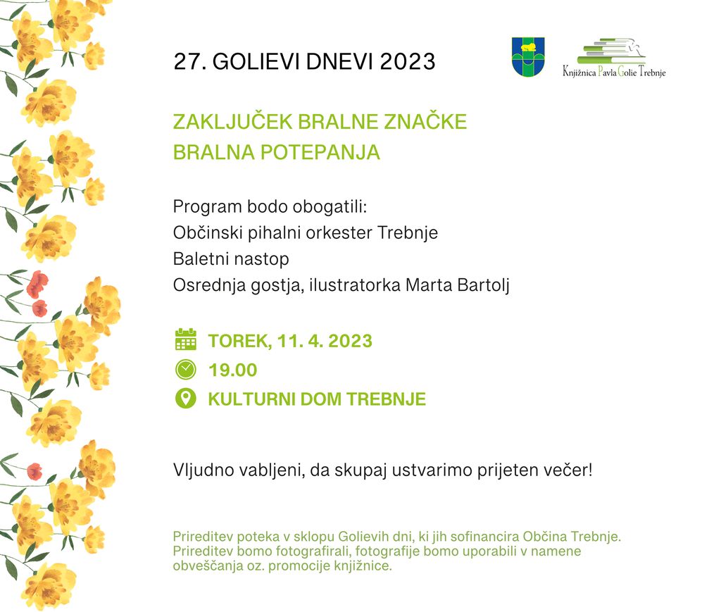 V torek, 11. 4. 2023 ob 19.00 vabljeni na osrednjo prireditev ob 27. Golievih dnevih, spominskih dnevih Občine Trebnje. Osrednja gostja bo ilustratorka Marta Bartolj, ki je ilustrirala ponatis Golieve drame Sneguljčica. Z Golievimi dnevi zaključujemo bralno značko za odrasle, Bralna potepanja, Sneguljčico pa bomo prvič ponesli med bralce ravno na ta večer. Golieve dneve finančno podpira Občina Trebnje.