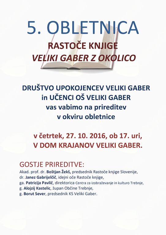 Društvo upokojencev Veliki Gaber in učenci OŠ Veliki Gaber vas vabimo na prireditev v okviru 5. Obletnice rastoče knjige Veliki Gaber z okolico. Vljudno vabljeni!