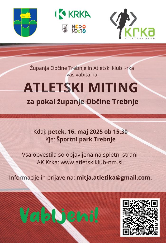 Občina Trebnje in Atletski klub Krka Novo mesto organizirata že 7. atletski miting v Trebnjem; ATLETSKI MITING ZA POKAL ŽUPANJE OBČINE TREBNJE. Tekmovanje je namenjeno vsem otrokom, tako registriranim tekmovalcem, kot tudi otrokom iz bližnjih osnovnih šol, vrtcev in mladim tekmovalcem v drugih športih. Poleg tega pa na atletski miting vabimo vse, ki se želijo preizkusiti v prirejenem atletskem troboju za rekreativce.
