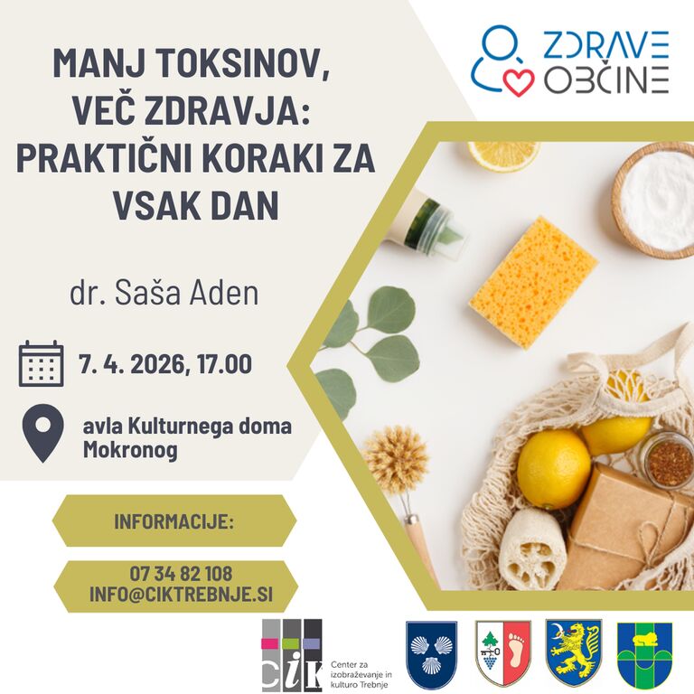 Vabljeni na brezplačno predavanje Manj toksinov, več zdravja: praktični koraki za vsak dan, v torek, 7. 4. 2026, ob 17.00 v avlo Kulturnega doma Mokronog, Pod Gradom 2, Mokronog. Na predavanje se lahko prijavite TUKAJ.