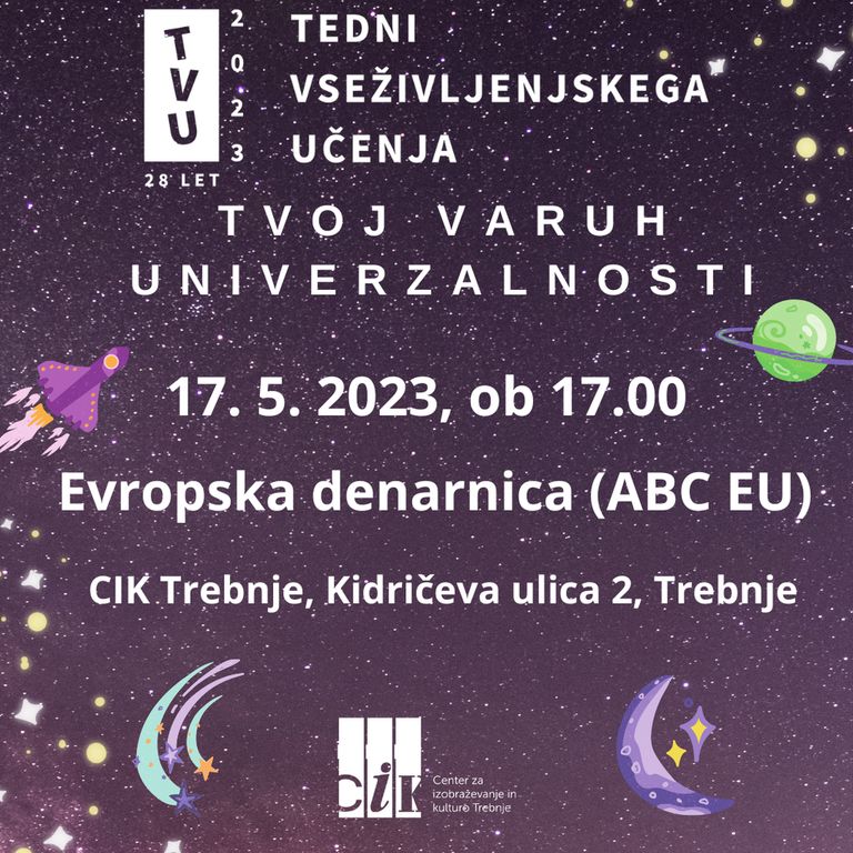 V okviru TVU2023 vas vabimo na delavnico Evropska denarnica (ABC EU), v sredo, 17. 5. 2023, ob 17.00 na CIK Trebnje, Kidričeva ulica 2.