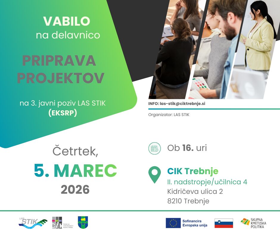 Za pripravo projektov bodo v štirih občinah območja LAS STIK organizirane delavnice, ki jih bo Center za izobraževanje in kulturo Trebnje (vodilni partner LAS STIK) izvedel prvi teden v marcu. V občini Trebnje bodo delavnico v četrtek, 5. marca 2026, ob 16. uri gostili na trebanjskem CIK-u. Na njej bodo predstavili podrobnejše informacije o pogojih prijave, upravičenih stroških in pripravi projektnega predloga.