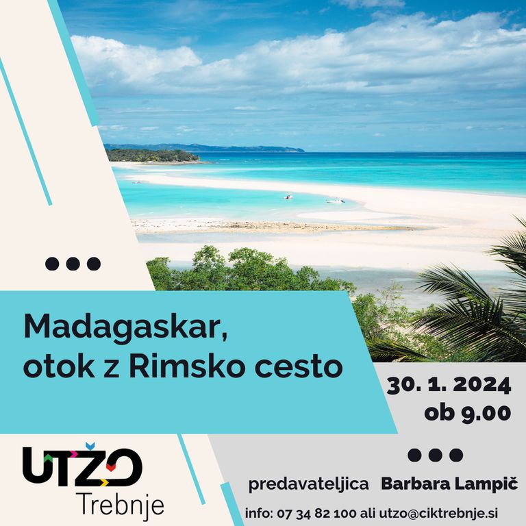 Na delavnici UTŽO Trebnje se bomo tokrat potepali po Madagaskarju. Madagaskar je otoška država, ki leži ob jugovzhodni obali Afrike. Je četrti največji otok na svetu, druga največja otoška država in 44. največja država na svetu. Njeno glavno in največje mesto je Antananarivo.