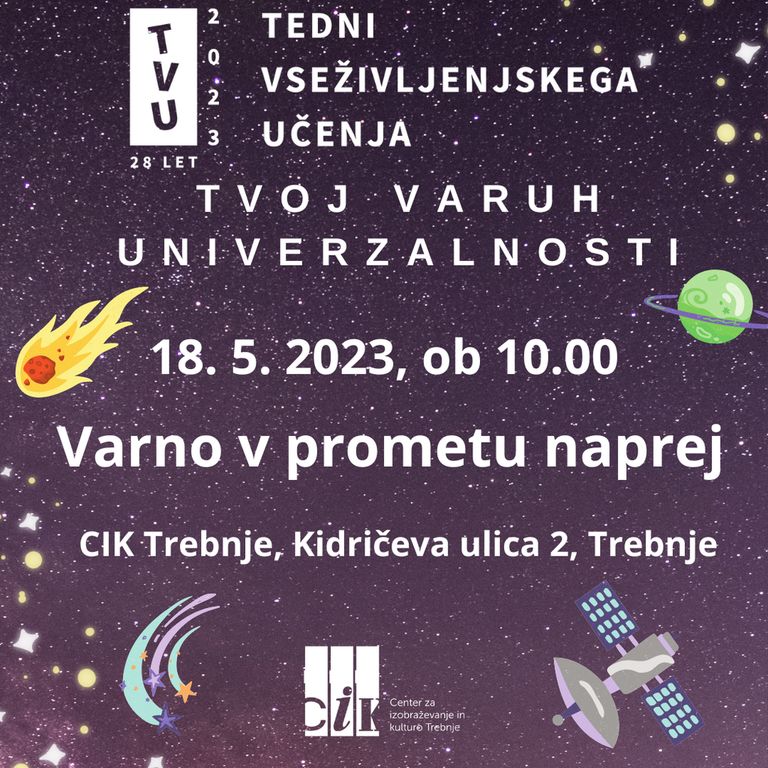 V okviru TVU2023 vas vabimo na delavnico Varno v prometu naprej, v četrtek, 18. 5. 2023, ob 10.00 na CIK Trebnje, Kidričeva ulica 2.