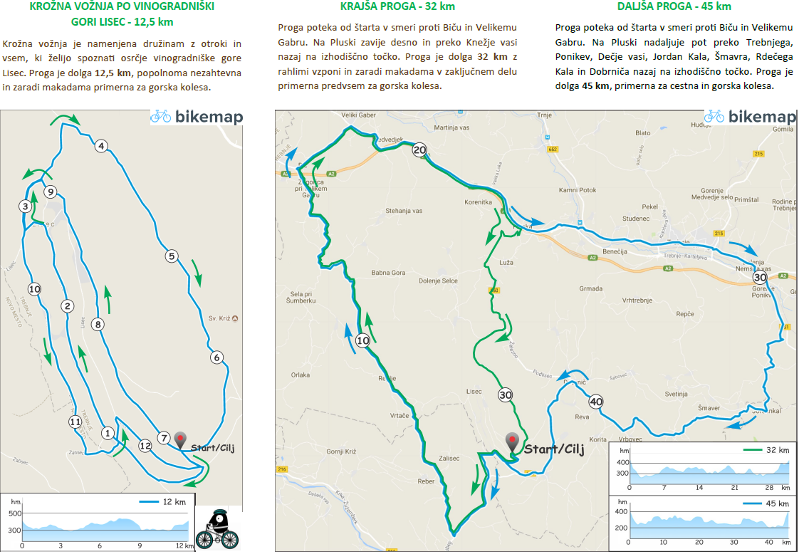 12,5 km – krožna vožnja po vinogradniški gori Lisec (trasa razvidna iz skice – krožna vožnja po vinogradniški gori lisec) ter v lastni režiji tudi daljša proga (32 km ali 45 km).