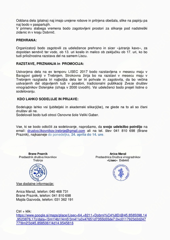 drustvo.likovnikov.trebnje@gmail.com ali na tel 041 810 698