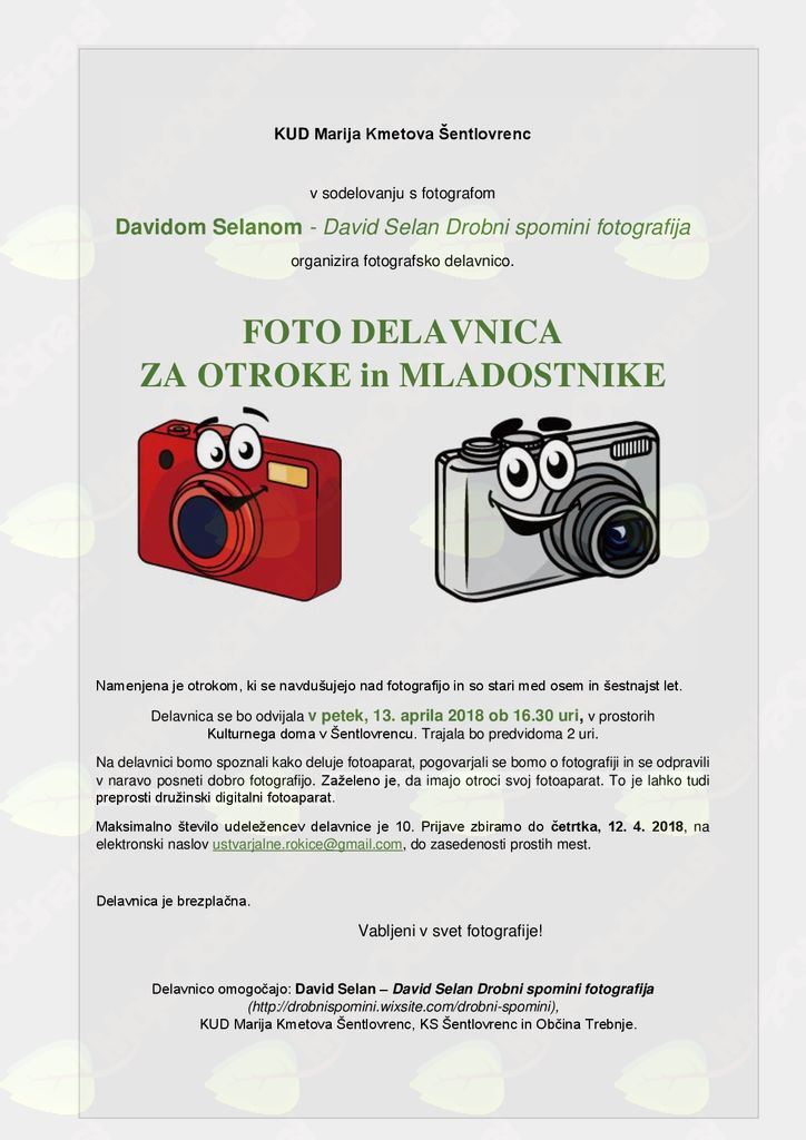 Na delavnici bomo spoznali kako deluje fotoaparat, pogovarjali se bomo o fotografiji in se odpravili v naravo posneti dobro fotografijo. Zaželeno je, da imajo otroci svoj fotoaparat. To je lahko tudi preprosti družinski digitalni fotoaparat.
