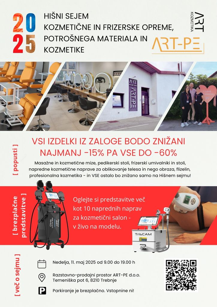 V nedeljo, 11. maja 2025, vas vabimo na tradicionalni Hišni sejem kozmetične in frizerske opreme, potrošnega materiala in kozmetike 2025, ki bo potekal v razstavno-prodajnem salonu ART-PE v Trebnjem.