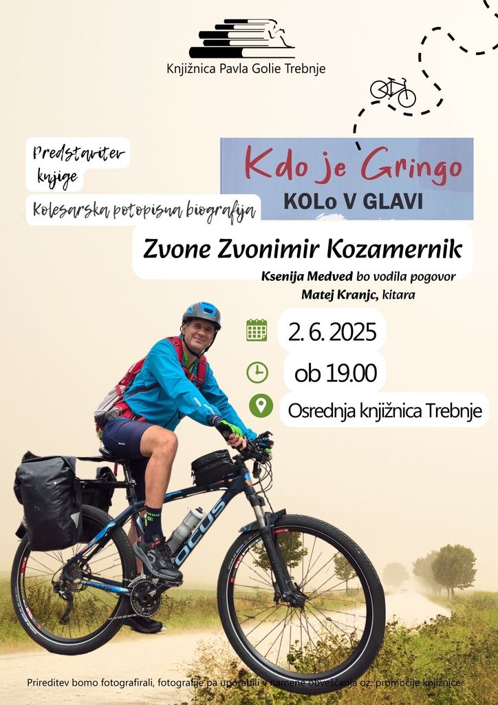 V ponedeljek, 2. 6. 2025, ob 19.00 vabljeni v Osrednjo knjižnico Trebnje na predstavitev kolesarskega potopisa Kdo je Gringo: KOLo V GLAVI Zvoneta Zvonimirja Kozamernika.