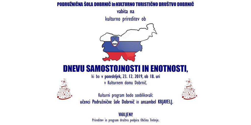 DNEVU SAMOSTOJNOSTI IN ENOTNOSTI, ki bo v ponedeljek, 23. 12. 2019, ob 18. uri v Kulturnem domu Dobrnič. Kulturni program bodo sooblikovali: učenci Podružnične šole Dobrnič in ansambel KRJAVELJ. VABLJENI! Prireditev in program društva podpira Občina Trebnje.