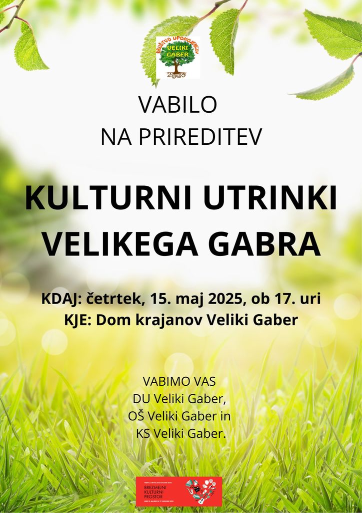 DU Veliki Gaber vas v sodelovanju z mentorji in učenci OŠ Veliki Gaber in učenci glasbenih šol ter dijakinjama Laro Sever in Najo Dobnik vabimo na kulturno prireditev KULTURNI UTRINKI VELIKEGA GABRA, ki bo 15. 5. 2025 v Domu krajanov Veliki Gaber, ob 17.00 uri.