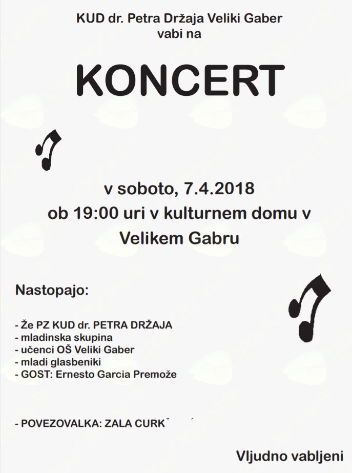 v soboto: 7.4.2018 ob 19. uri v kulturnem domu v Velikem Gabru