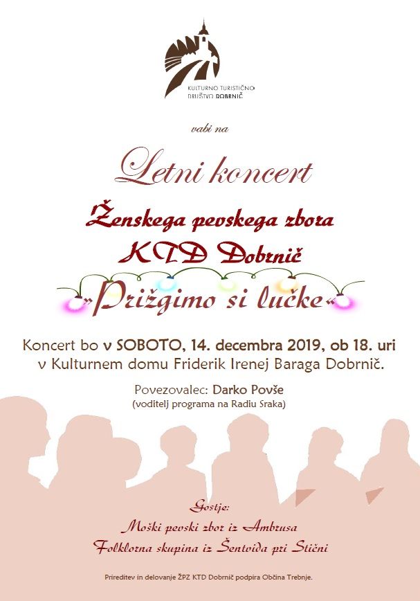 Kulturno turistično društvo Dobrnič vabi na LETNI KONCERT ŽENSKEGA PEVSKEGA ZBORA KTD DOBRNIČ z naslovom "PRIŽGIMO SI LUČKE".