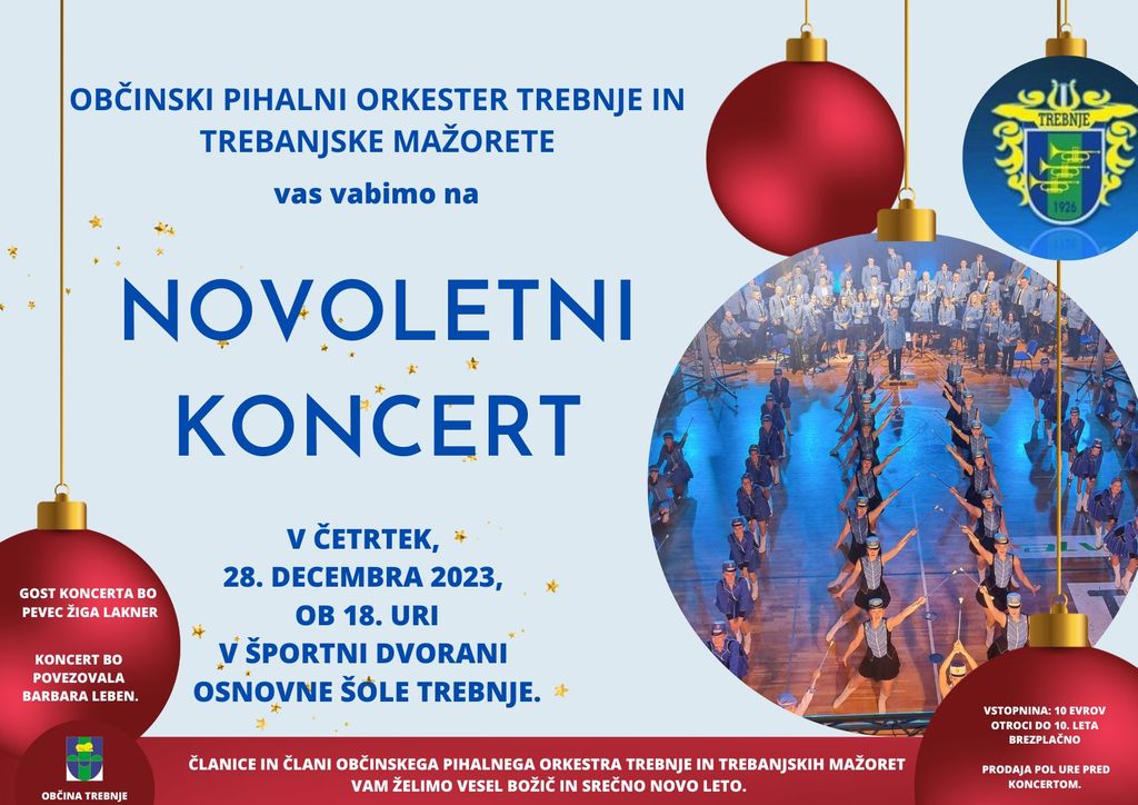 Na tradicionalnem novoletnem koncertu bomo izvajali različne skladbe. Skupaj z orkestrom bodo nastopile tudi različne starostne skupine Trebanjskih mažoret. Orkester bo igral skladbe primerne novoletnemu času. Mažoretne skupine bodo nastopile s točkami s katerimi so osvojile prva mesta na Pokalu ADA v Čitluku 30. septembra 2023. Gost koncerta bo pevec Žiga Lakner. Koncert bo povezovala Barbara Leben.