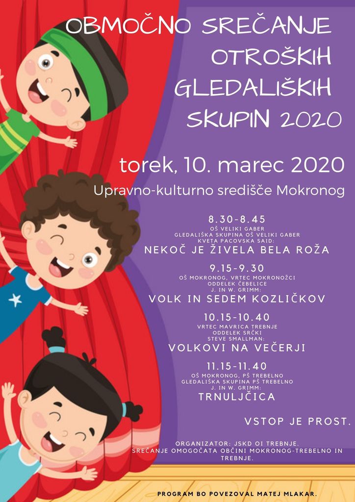 Toplo vabljeni na Območno srečanje otroških gledaliških skupin 2020, ki se bo odvilo v Upravno-kulturnem središču Mokronog.