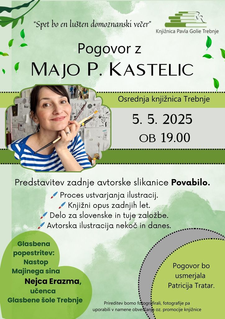 V ponedeljek, 5. 5. 2025, ob 19.00, vabljeni v Osrednjo knjižnico Trebnje na pogovorni večer z Majo P. Kastelic.